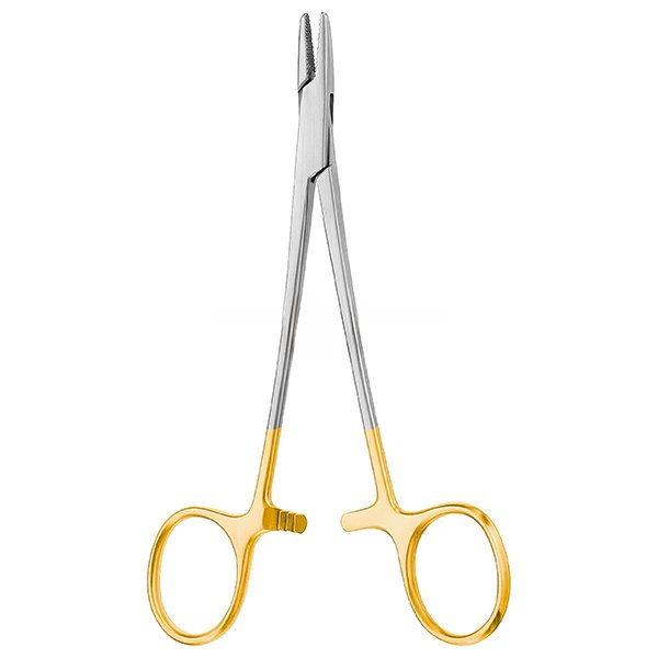 PORTA AGUJAS BAUMGARTNER MANGO DORADO, PUNTA EN TUNGSTENO DE 12,5 CMS. CAT: 24.154.12 MARCA: DIMEDA – ALEMAN UNIDAD DE VENTA: UNIDAD USO: SE UTILIZA PARA SOSTENER UNA AGUJA, Y AYUDAR A SUTURAR